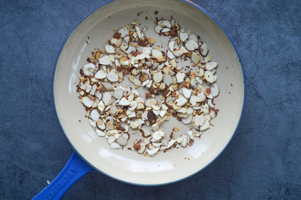 Next, toast slivered almonds over medium heat in a skillet. You don’t need any oil to get the golden brown color on the almonds.