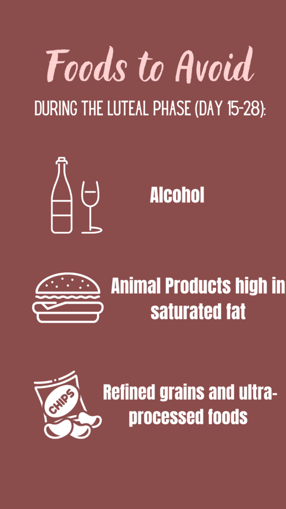 Certain foods will make you feel worse when you’re experiencing PMS symptoms during the luteal phase. Try to avoid these foods during this time.