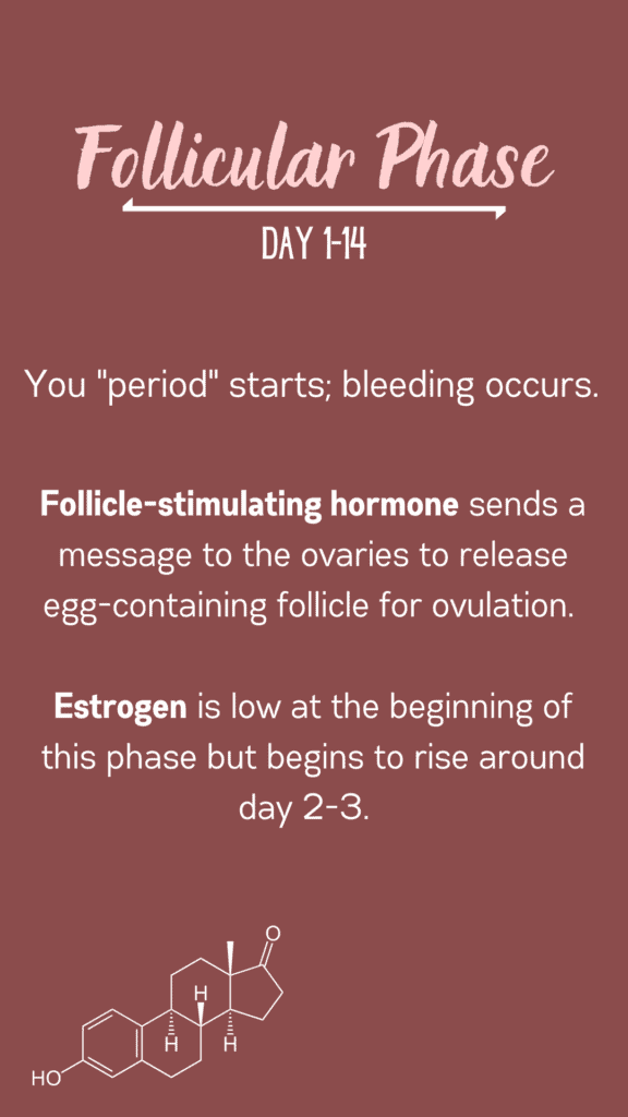 The beginning of menstruation is also the start of the follicular phase. This phase varies in length, and it’s marked by an increase in estrogen levels. During the follicular phase, the brain uses a hormone called follicle-stimulating hormone (FSH) to send a message to the ovaries to release an egg for ovulation.