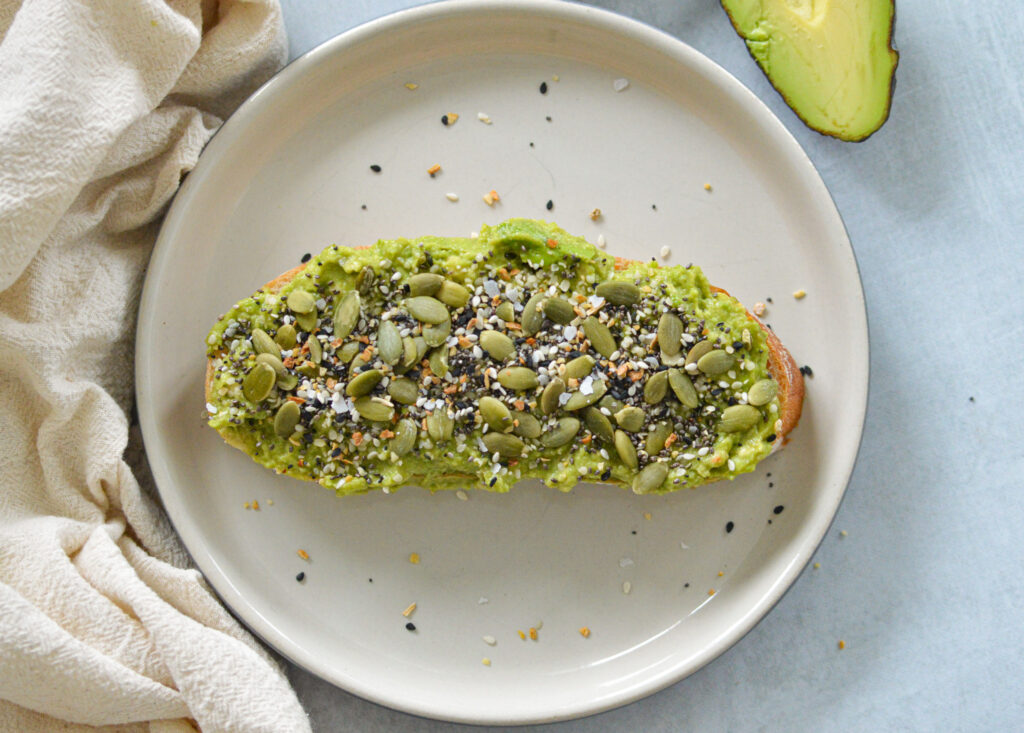 I call this version “super seed avocado toast” because it has several different seeds. First, it’s topped with both pumpkin and sunflower seeds for texture and a plant protein boost. Then, sprinkle on the everything but the bagel seasoning, which has sesame and poppy seeds, both of which add a slight crunch and a boost of flavor.