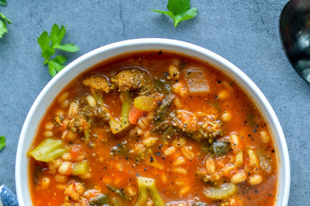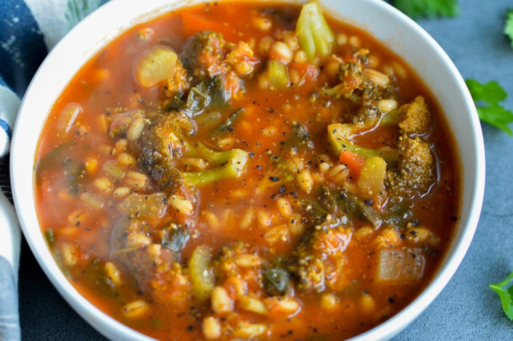 Who doesn’t love a good soup in the winter (or fall)? I sure love soup because it’s easy to make and incorporates tons of healthy veggies. This old fashioned vegetable barley soup is plant-based and includes carrots, celery, broccoli, tomatoes, spinach and barley, of course!