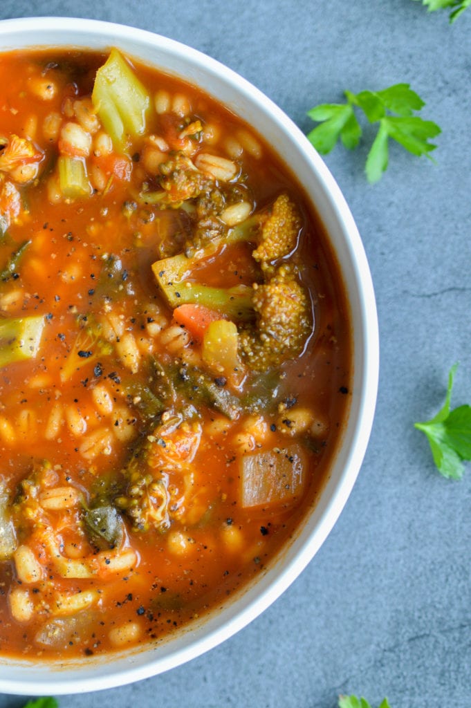 As far as soups go, this is about as healthy as you can get! The base of this soup is vegan and loaded with plants. It’s made with a combination of celery, carrots, garlic, crushed tomatoes, spinach and vegetable broth.