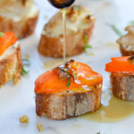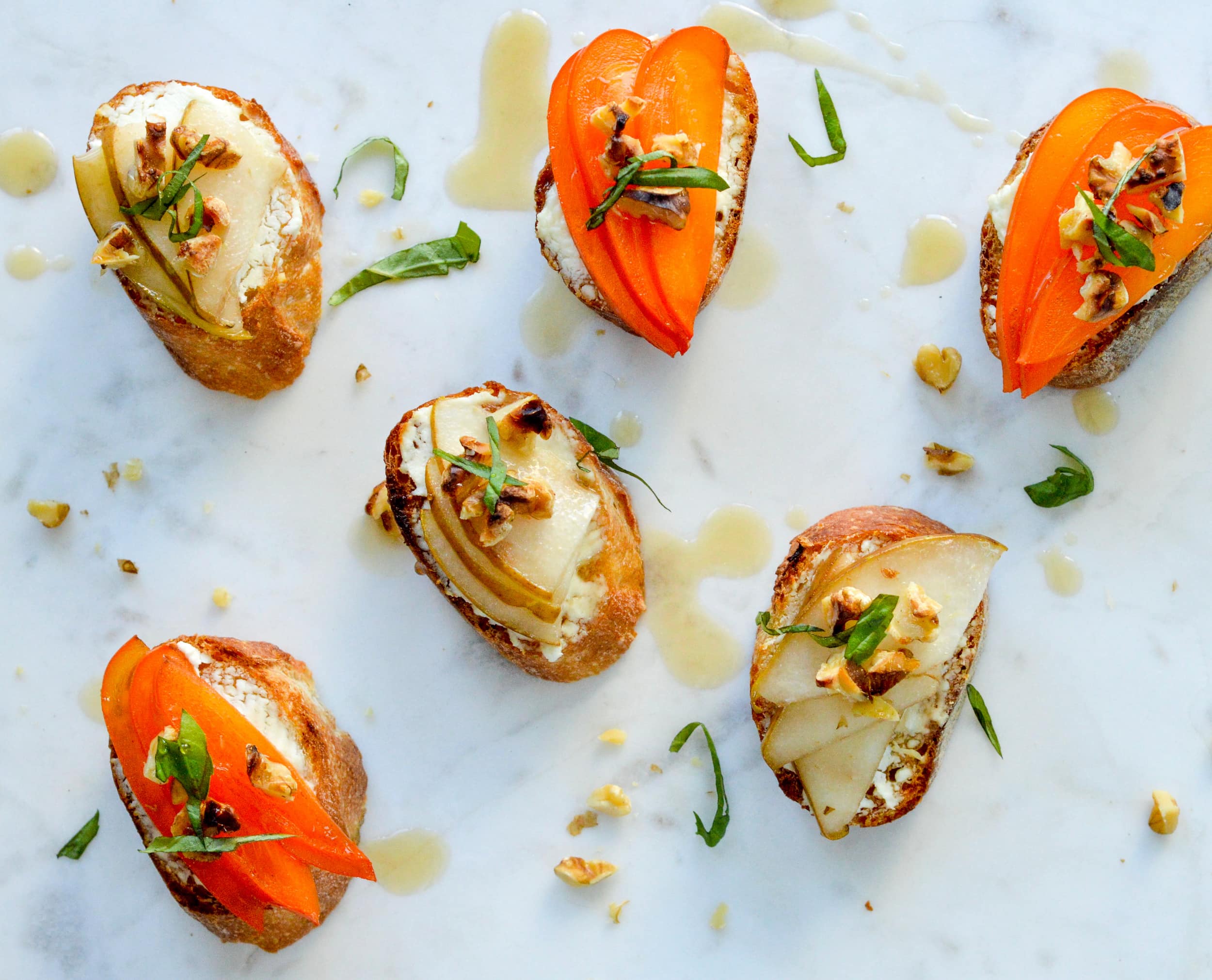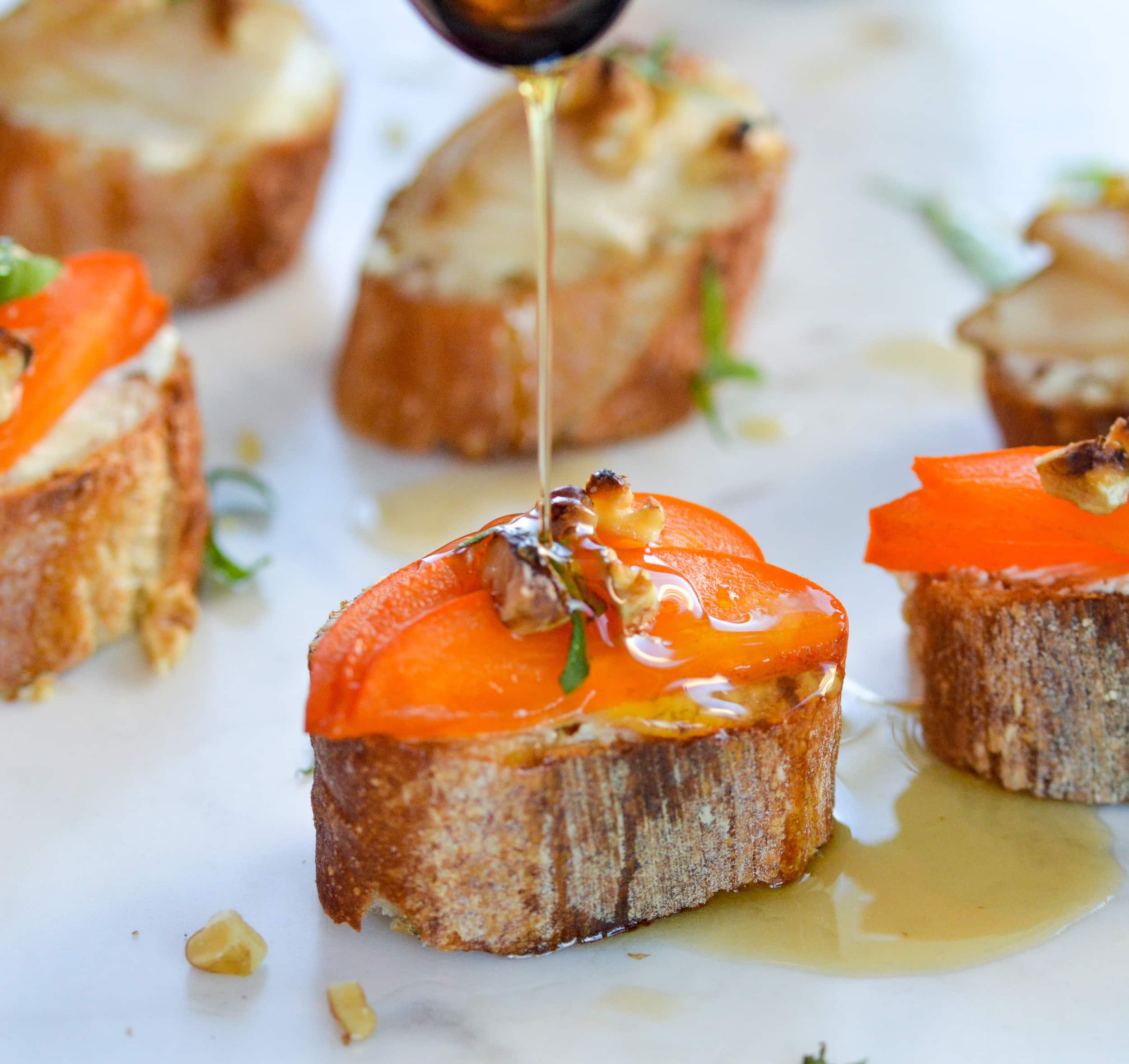 This bite sized crostini recipe features goat cheese, pears or persimmons, walnuts, pure maple syrup and a dash of basil. In this recipe, I use pears and persimmons because they are both in season and balance well with the savory goat cheese. The walnuts add a nice toasted flavor and crunchy texture, while the basil supplies a freshness to the appetizer. Lastly, the pure maple syrup brings the sweet and salty flavors together.