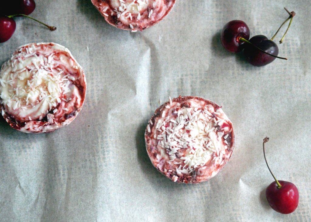 - In a muffin tin, alternate between a layer of the yogurt mixture followed by a layer of cherries to make a beautiful swirl. Repeat until the muffin tins are filled.