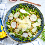 This Warm Farro & Arugula Salad is a bowl of gorgeous spring ingredients over a bed of whole grain farro, topped with shaved parmesan cheese, black pepper and Sir Kensington’s® Golden Citrus Vinaigrette.