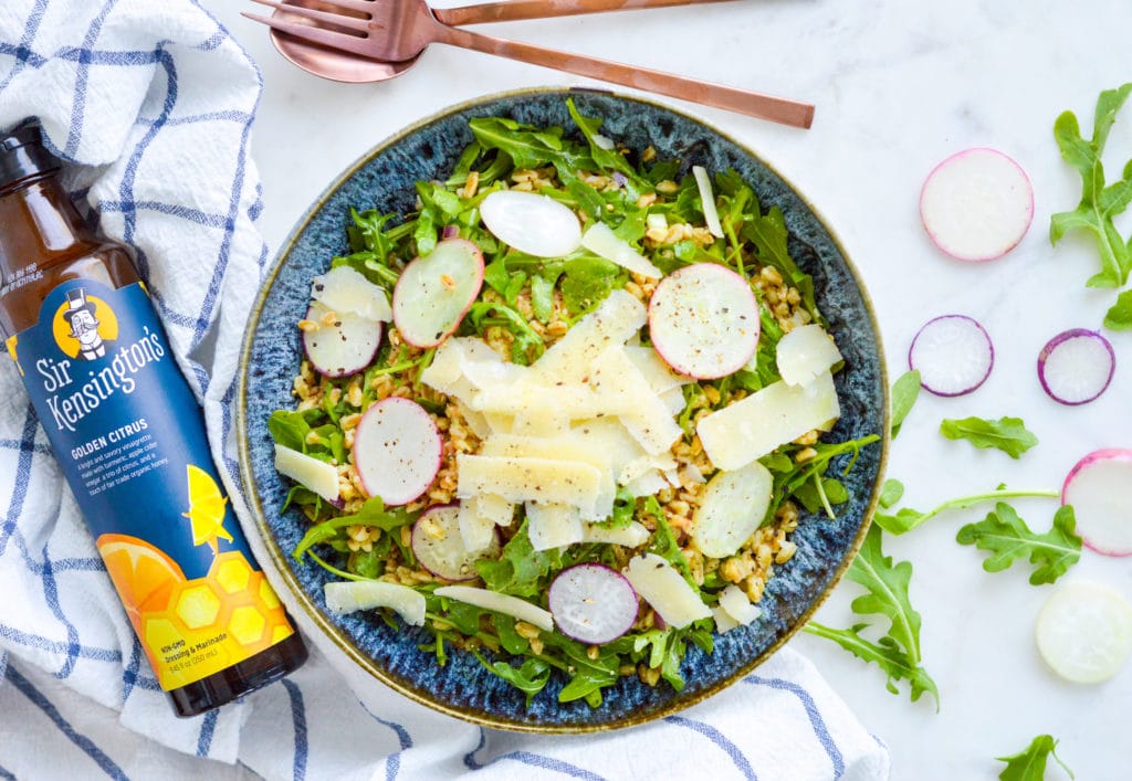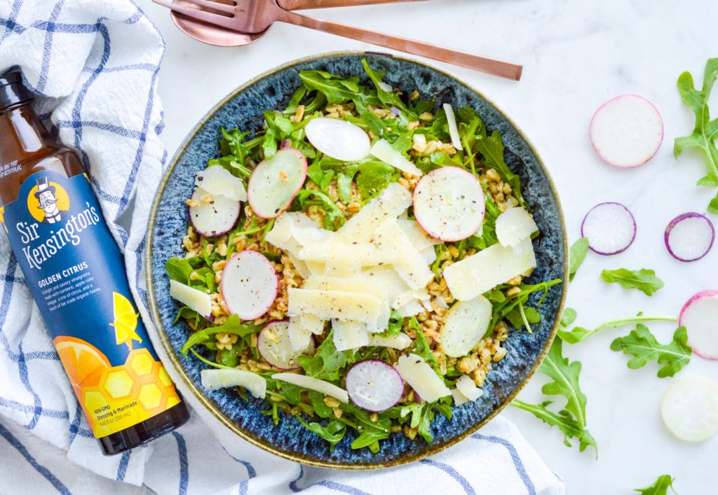 • Once the farro has cooled to room temperature, place it in a large bowl. Add the arugula, radishes, red onion, Sir Kensington’s Golden Citrus Vinaigrette and salt to the bowl and toss to combine. Top with shaved parmesan cheese and freshly cracked pepper. Serve immediately or refrigerate for up to 4 days.
