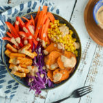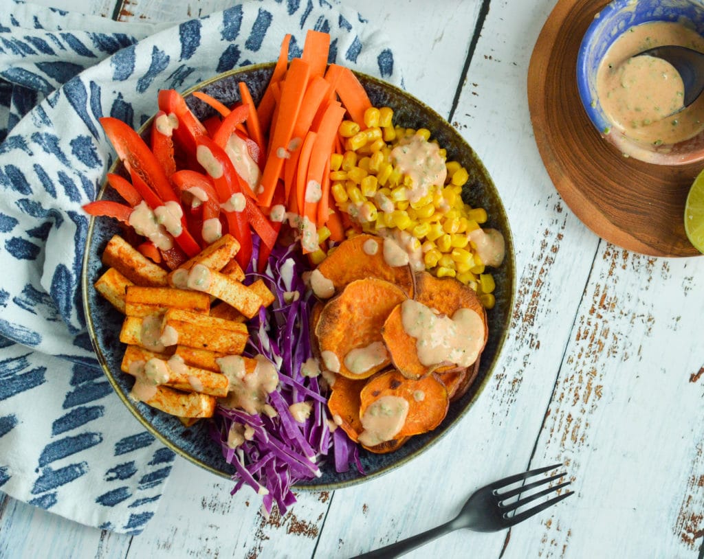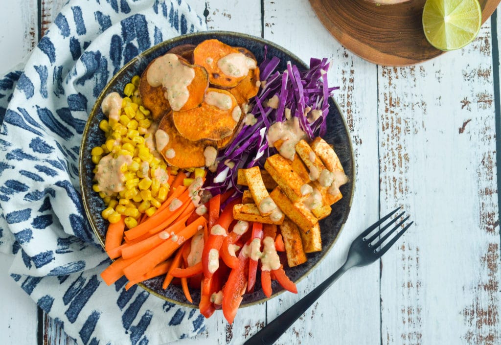 - Build the bowl with the corn, red cabbage, red peppers, carrots, cooked sweet potatoes and tofu. Season with salt.