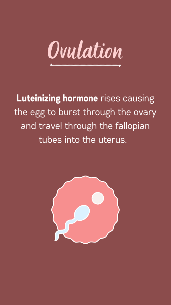 Day 14: Ovulation occurs and your “fertile window” is open for 12-24 hours. Estrogen peaks right before ovulation, which increases luteinizing hormone, the hormone that stimulates the release of the egg from the follicle into the uterus.
