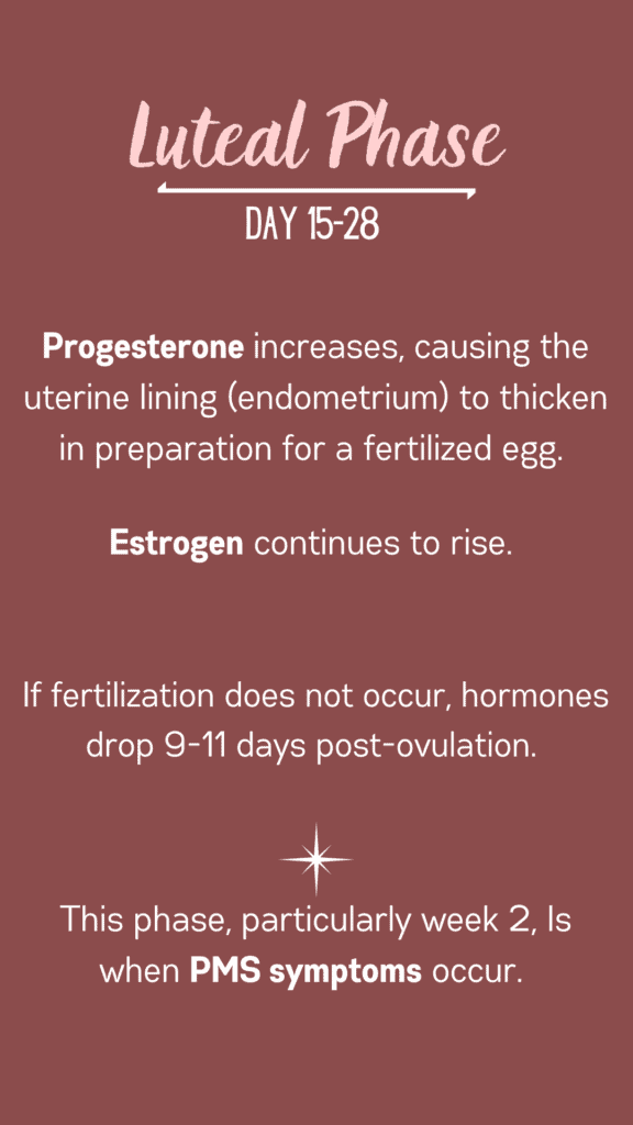 The luteal phase is associated with “premenstrual” (PMS) symptoms, such as headaches, acne, bloating, tender breasts, mood changes, nausea and/or vomiting. In fact, there are over 150 different symptoms associated with PMS!