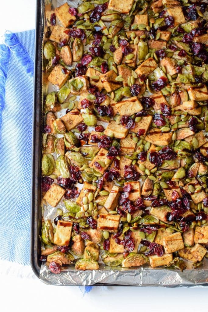 An easy sheet pan meal of brussels sprouts, tofu, cranberries, and pumpkin seeds with quick clean up is the perfect dinner for after a long and crazy workday.