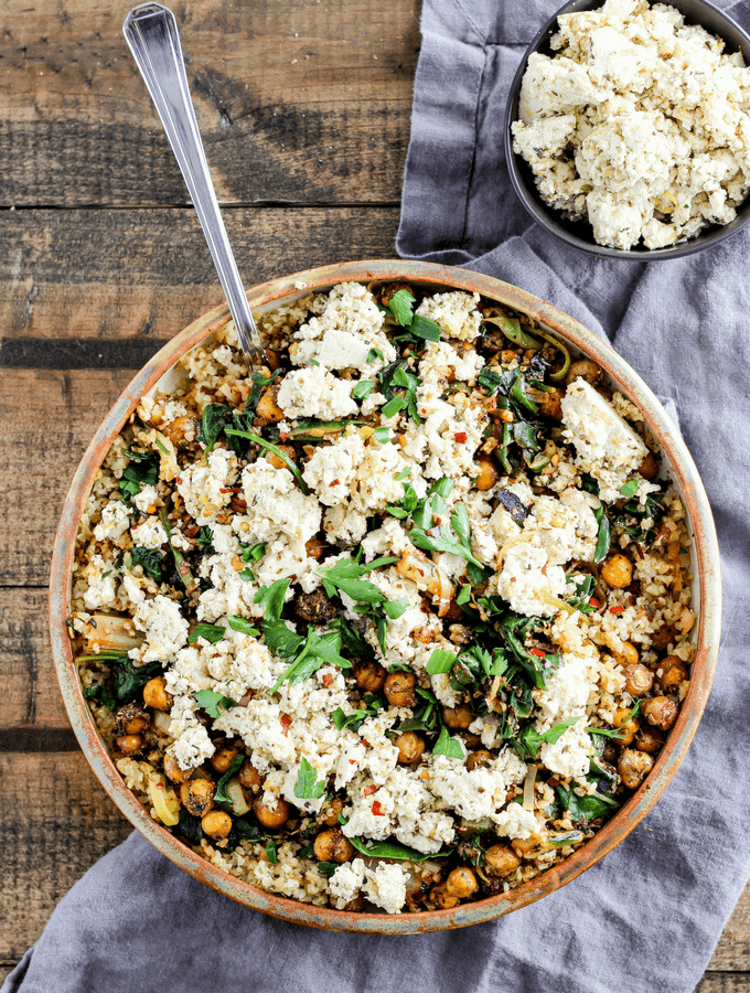 Greek Roasted Chickpeas with Tofu Feta and Freekeh by Grateful Grazer