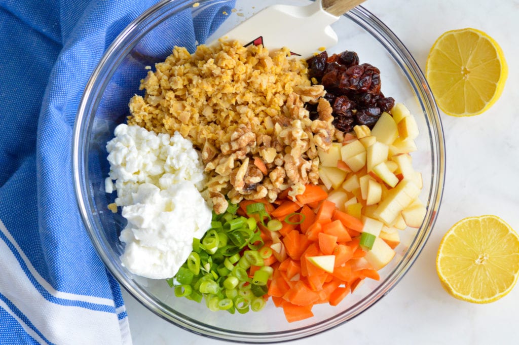 - Place the smashed chickpeas in a large bowl. Add the apple, carrots, scallions, walnuts, dried cranberries, cottage cheese, Greek yogurt, lemon juice and salt. Stir until well combined.