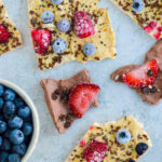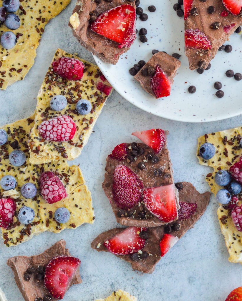 How to make healthy frozen yogurt bark two ways: Chocolate Covered Strawberry & Peanut Butter Berry. Enjoy this sweet high protein frozen snack any time of the day!