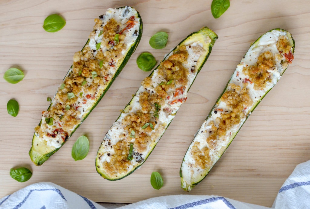 These Ricotta Stuffed Zucchini Boats are a simple vegetarian main dish that is GREAT for meal prepping and is high in protein and low in carbs. They are stuffed with a mixture of ricotta cheese, basil and sun dried tomatoes for a satisfying and tasty main dish. #vegetarianrecipe #vegetariandinners #zucchiniboats
