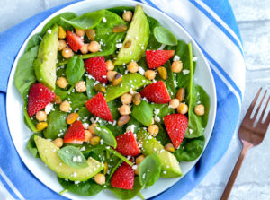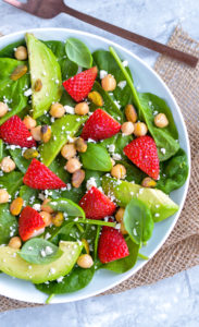 Plus, it’s got nuts, cheese, avocados and beans, which means this salad is filling enough to be a meal in itself. You’re getting plenty of healthy fats from the avocado and pistachios, as well as protein from the chickpeas, feta and nuts and tons of vitamins, minerals and antioxidants from the spinach, basil and strawberries. Top it with whatever dressing you like and you’ll be super full and satisfied.