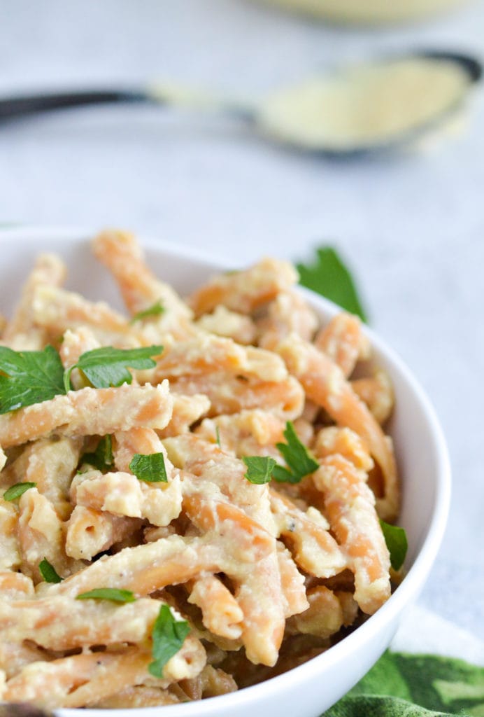 The vegan alfredo sauce is made with cauliflower, cashews and nutritional yeast for a simple dairy-free pasta topping that comes together in 20-minutes or less!